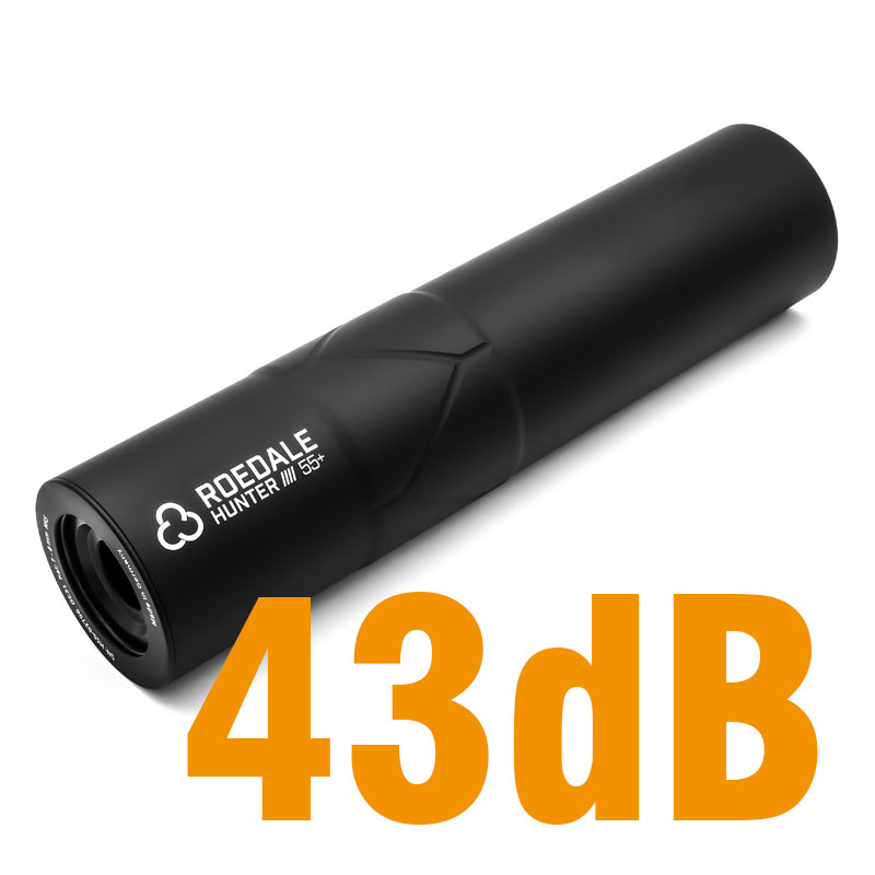 A Roedale Hunter 55+ egy nagy méretű, nagy teljesítményű hangtompító. A beépített rozsdamentes acél hálónak köszönhetően a teljesítmény kb. 3 dB-lel nő a szabványos Hunter 55-höz képest. Ez a modell lenyűgöző csillapításával, nagy robusztusságával és méreteivel, amelyek még mindig teljesen alkalmasak a használatra. A Hunter 55+ teljesítményének és méretének köszönhetően kategóriájában vezető szerepet tölt be. Független teszteken is bebizonyosodott, hogy a leghalkabb modell a piacon, és a megfelelő választás mindenki számára, aki a maximális csillapítást keresi. A Roedale Hunter 55+ cső feletti hangtompítóval rendelkezik. A menethossztól függően a tágulási kamra kb. 70 mm-rel hátrafelé húzódik a csövön, csak 158 mm-rel hosszabbítja meg a fegyvert. A tágulási kamra egy integrált egység, és nem záródik a puskacsőre. A Roedale Hunter 55 egymagos hangtompító (belső rész + külső héj), átmérője 55 mm. Ez a hangtompító nagyon erős, és kiváló kompromisszum a zajcsökkentés és a teljes hossz között. Az alkatrészeket szilárd nyersdarabokból marják és esztergálják modern CNC gépeken, nagy szilárdságú alumíniumötvözetből a repülőgépiparból és a védelmi iparból (kivéve a polioximetilénből készült vezetőt). A felületek ezenkívül edzettek, bevonatosak és Mil-Spec Type III feketére kemény-anodizáltak. A hangtompító alap menete: M22x1,5